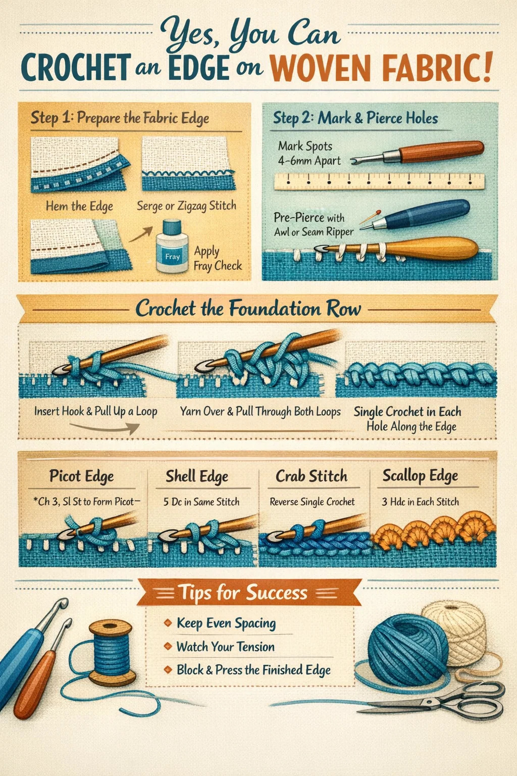 ผ้าทอไม่มีห่วงธรรมชาติสำหรับสอดตะขอต่างจากผ้าถัก แต่คุณเจาะทะลุเนื้อผ้าหรือเจาะรูที่ทำไว้ล่วงหน้า ซึ่งเป็นเหตุผลว่าทำไมเทคนิคและการจัดเตรียมจึงสร้างความแตกต่างได้ เมื่อคุณเข้าใจกลไกแล้ว การเสริมขอบโครเชต์ให้กับผ้าทอ ไม่ว่าจะเป็นผ้าฝ้าย ผ้าลินิน เดนิม หรือผ้าทออื่นๆ จะกลายเป็นทักษะที่น่าพึงพอใจและทำซ้ำได้