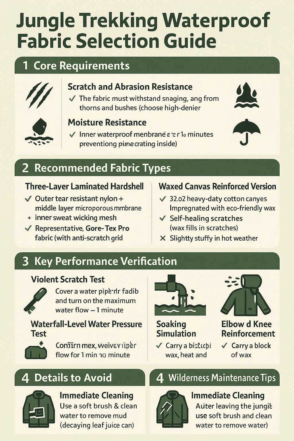 การทำความสะอาดทันที: หลังจากออกจากป่าแล้ว ให้ใช้แปรงขนนุ่มและน้ำสะอาดเพื่อขจัดโคลน (น้ำใบที่เน่าเปื่อยสามารถกัดกร่อนชั้นกันน้ำได้)