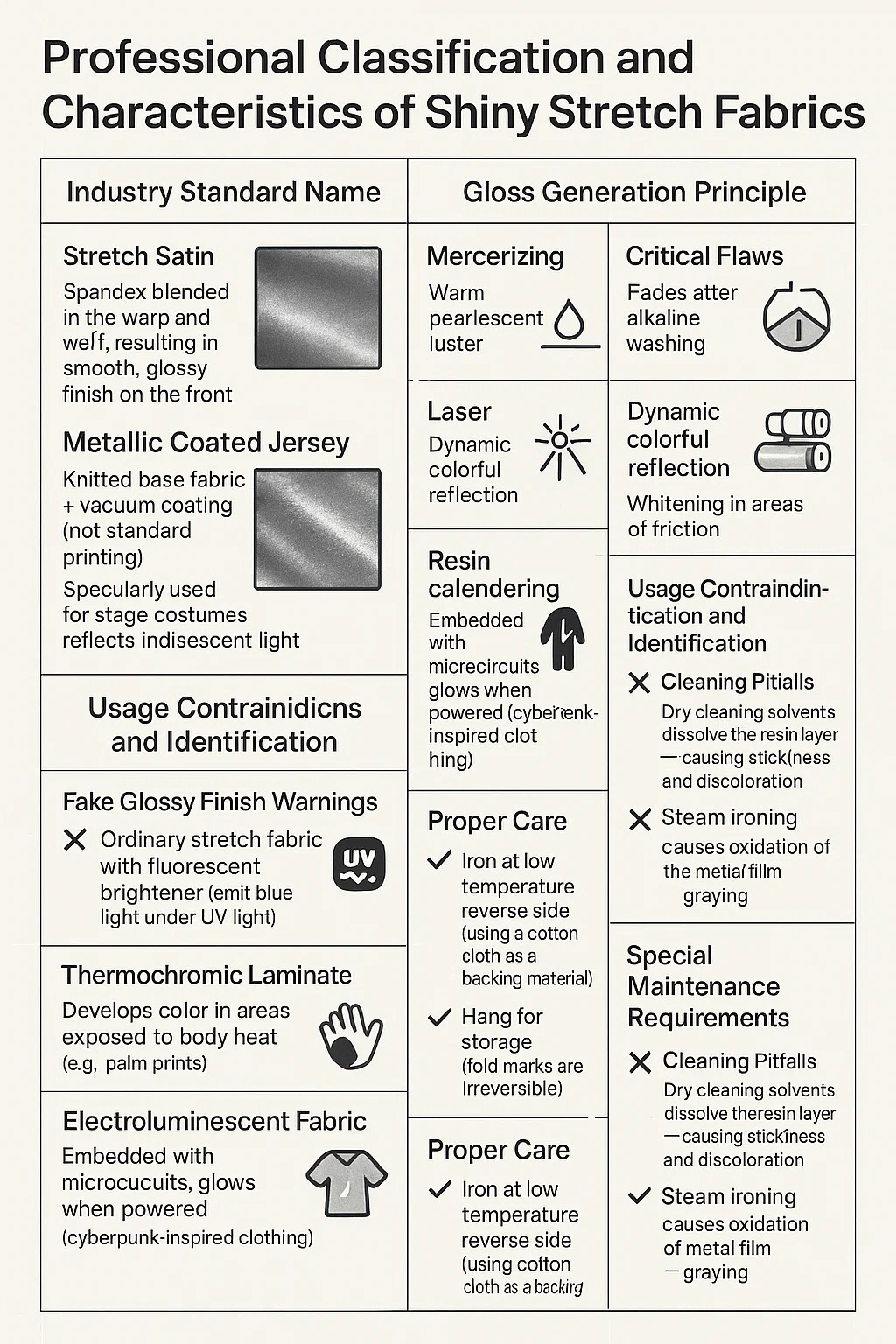 คำเตือนการเคลือบเงาปลอม: ผ้ายืดธรรมดาที่มีสารเพิ่มความสดใสจากฟลูออเรสเซนต์ (ปล่อยแสงสีฟ้าภายใต้แสง UV) เคลือบ PVC คุณภาพต่ำ (ทิ้งรอยสีขาวถาวรเมื่อพับ)